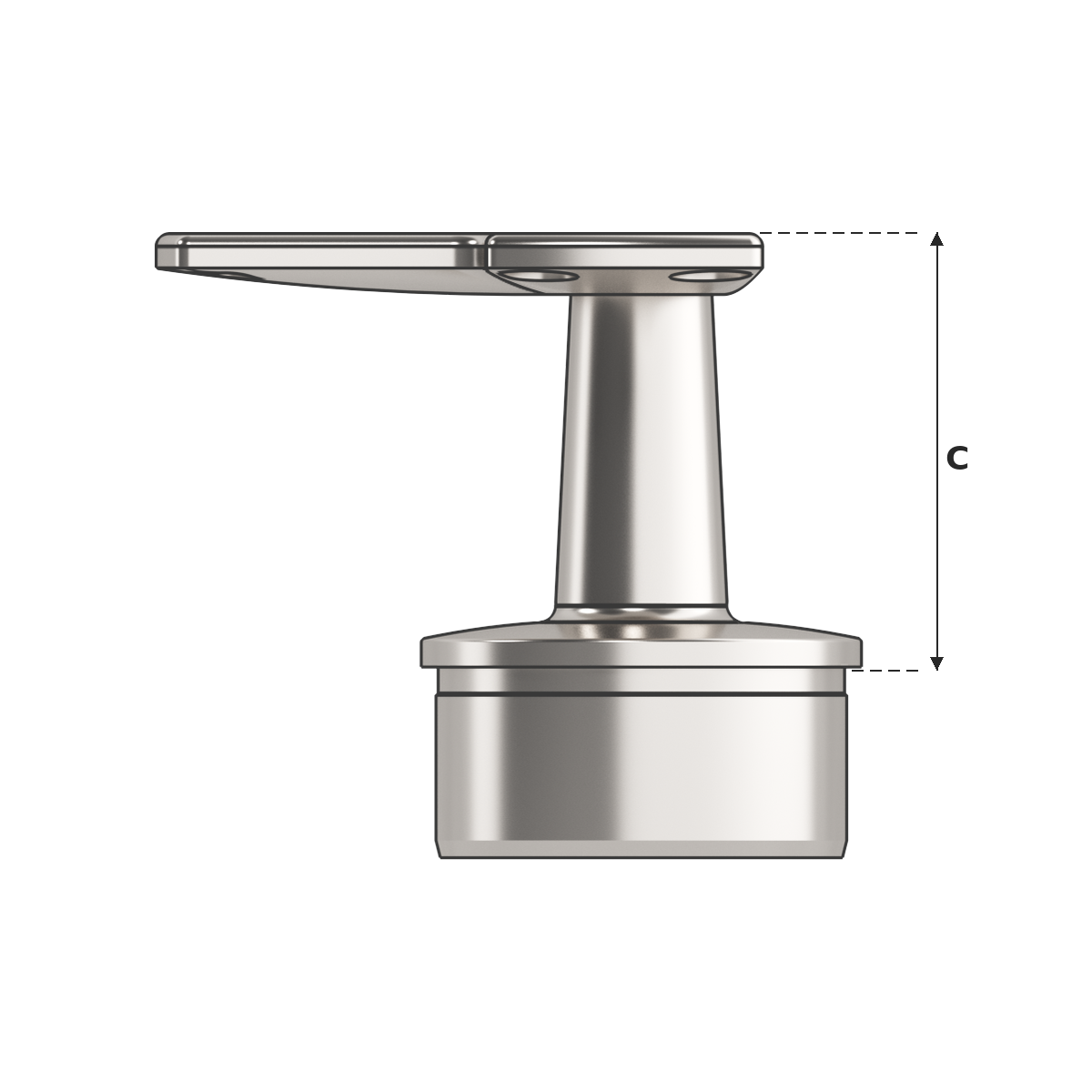Corner Post Top with flat saddle top (suits flat bar handrail), designed for corner post positions where the handrail changes direction at 90 degrees. This post top assembly is designed to fit 50.8mm x 1.6mm round tube and is supplied in satin finish. Used in conjunction with stainless steel tube and other handrail fittings to create functional balustrade and handrail systems.