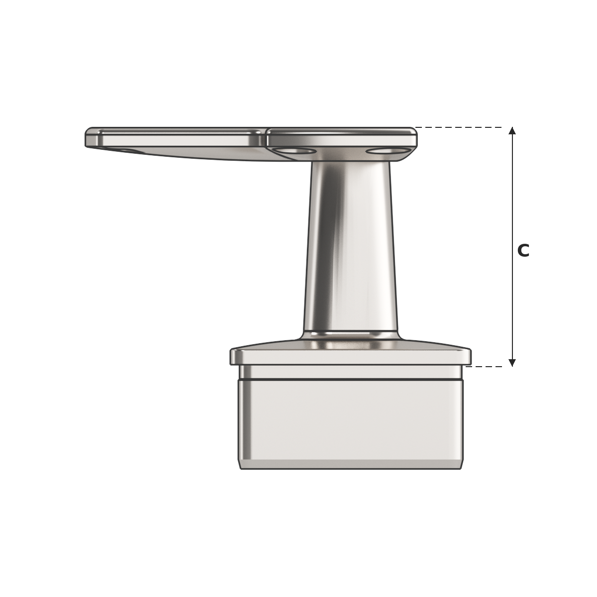 Corner Post Top with flat saddle top (suits flat bar handrail), designed for corner post positions where the handrail changes direction at 90 degrees. This post top assembly is designed to fit 50.8mm x 3.0mm square tube and is supplied in mirror polish. Used in conjunction with stainless steel tube and other handrail fittings to create functional balustrade and handrail systems.
