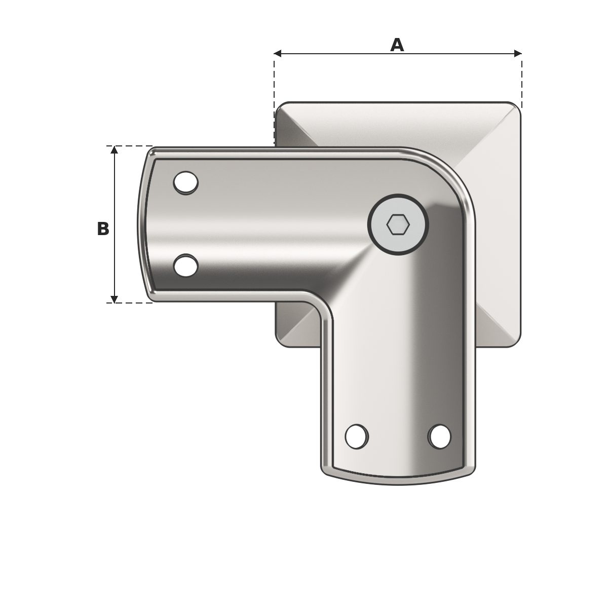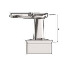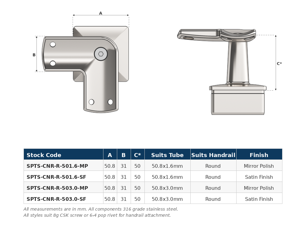 Corner Post Top with round saddle top (suits round tube handrail), designed for corner post positions where the handrail changes direction at 90 degrees. This post top assembly is designed to fit 50.8mm x 3.0mm square tube and is supplied in mirror polish. Used in conjunction with stainless steel tube and other handrail fittings to create functional balustrade and handrail systems.