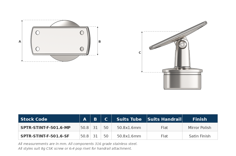Stair Intermediate Post Top with flat saddle top (suits flat bar handrail), designed for intermediate (inline) post positions along stairway handrail sections where the rail follows the stair pitch. This post top assembly is designed to fit 50.8mm x 1.6mm round tube and is supplied in mirror polish. Used in conjunction with stainless steel tube and other handrail fittings to create functional balustrade and handrail systems.
