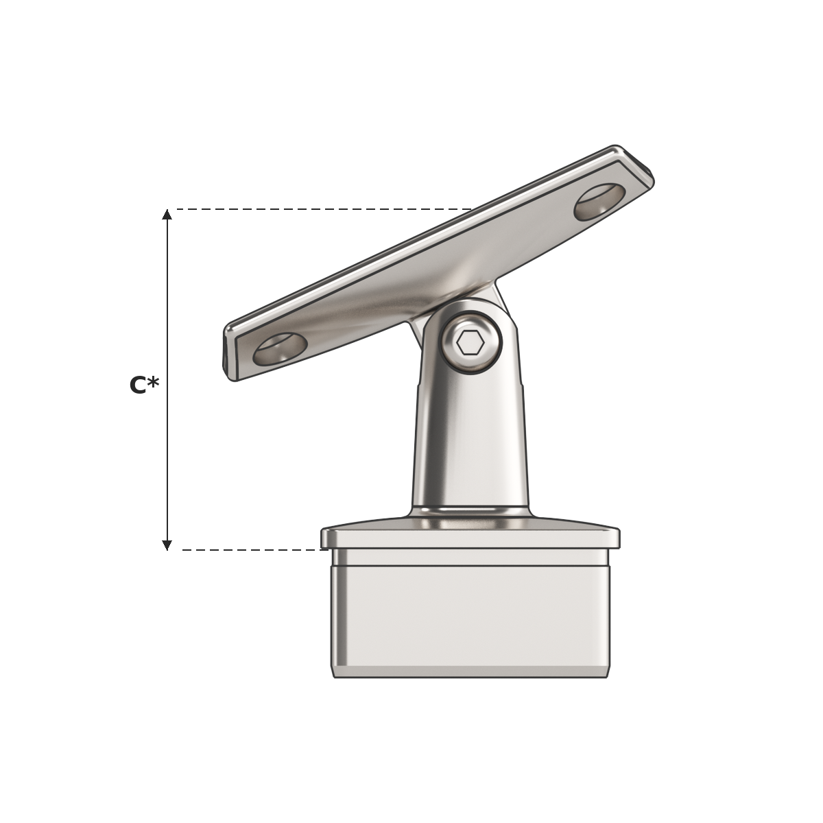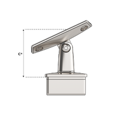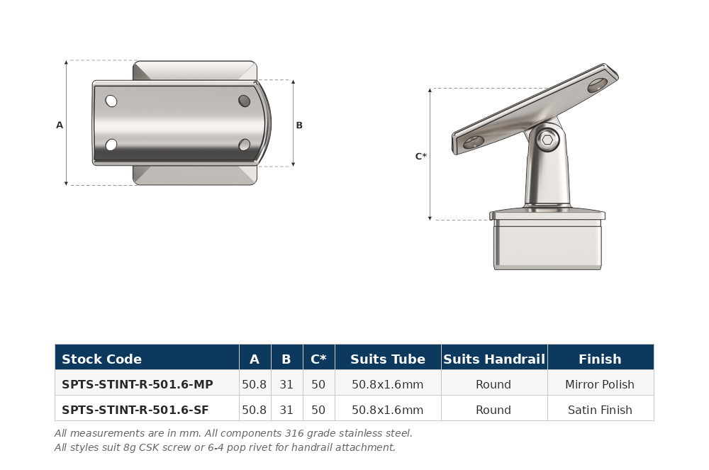 Stair Intermediate Post Top with round saddle top (suits round tube handrail), designed for intermediate (inline) post positions along stairway handrail sections where the rail follows the stair pitch. This post top assembly is designed to fit 50.8mm x 1.6mm square tube and is supplied in mirror polish. Used in conjunction with stainless steel tube and other handrail fittings to create functional balustrade and handrail systems.